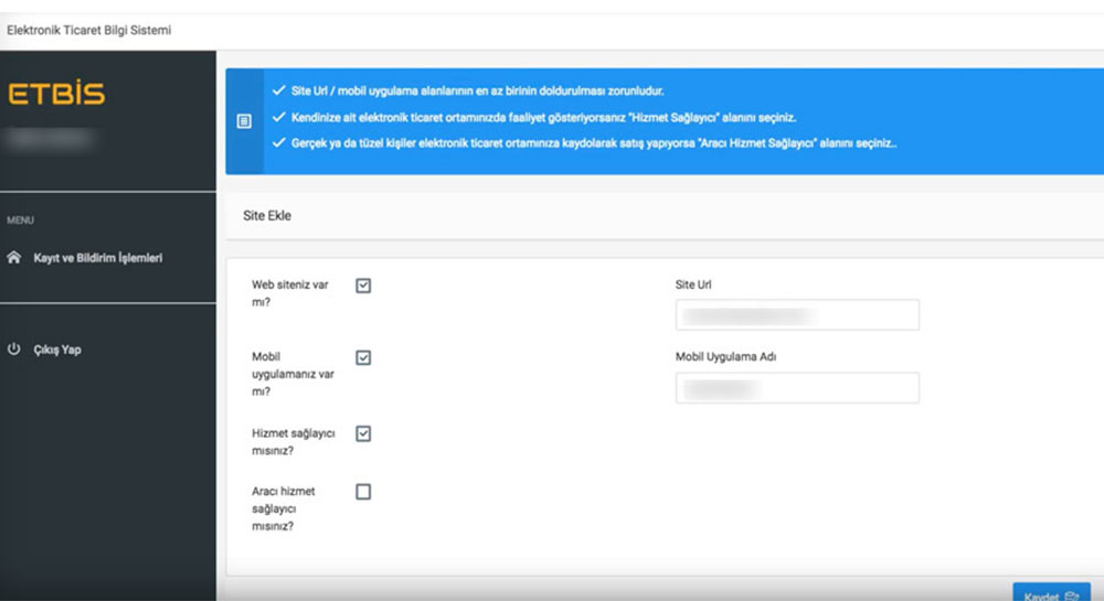 Yeni kayıt ekle yazısına tıkladıktan sonra aşağıdaki görseldeki gibi bilgilerin girişini yapmanız gerekecek. Burada internet sitenizin adresini, varsa mobil uygulamanızın adını ve hizmet sağlayıcı bilgilerinizi yazmalısınız.