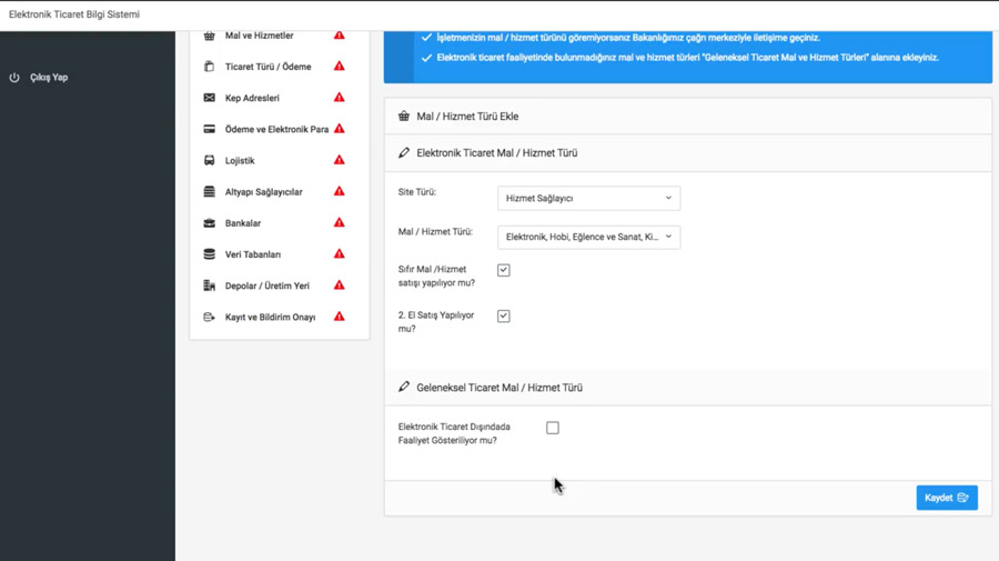 Yukarıdaki işlemleri tamamladıktan ve Kaydet butonuna tıkladıktan sonra sonra, işletme adı, MERSİS ve Vergi Numaranızın girildiği bölüme geleceksiniz. Eğer yurtdışına da satışınız varsa, alttaki sınır ötesi eticaret satışı kutusunu da işaretleyin.
